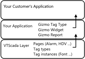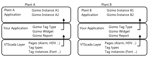 Two plants use The Gizmo brand hardware for their operations. Your application will be distributed to both plants to serve as the OEM layer for their applications. The applications at Plant A and Plant B also inherit all the features of the underlying VTScada layer, so they also have all the standard tags, widgets, reports, etc.