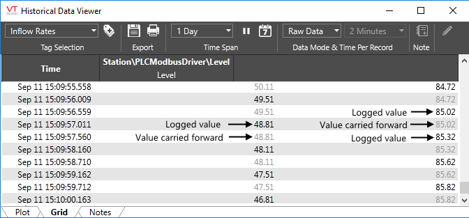 The grid is a powerful tool for viewing a report of process values. You may choose to view raw values as logged or you can select averages, minimums or maximums over a given amount of time per record (row). Note that the list of available Time Per Record options will not include a value larger than the selected time span of the grid. Also, values that are significantly smaller than the displayed range will not be available.