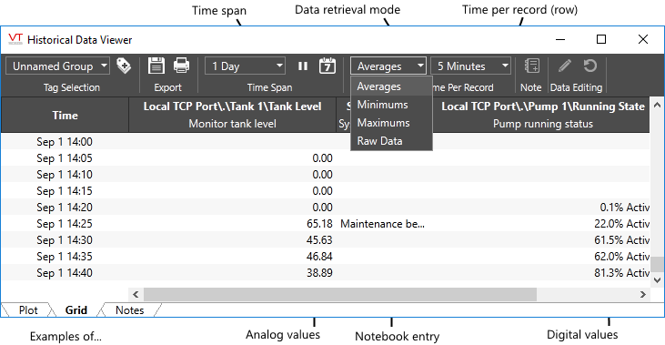As an example, you might configure the grid to display maximum values recorded in each fifteen-minute time span for the past day. For a finely-detailed report, you might configure the grid to show average values for each one-minute time span (or less) over the past week. Any combination that you configure may then be exported to a file for use in a report. A significant advantage to using averages over small time spans is that the time stamps will match for each tag's value, which will not be the case when exporting raw data.