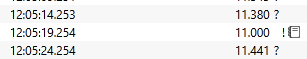 The value column in the grid view, or the value in the legend of the plot view may include any of an exclamation mark (!), a question mark (?) or a notebook icon. Here's an example from the grid view showing all three: