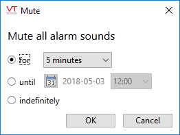 Mute blocks all alarm notification from your computer's speaker. You must choose the duration of muting and you can unmute the alarms at any time, allowing sounds to resume. New alarms are also muted - the button applies to all current and future alarms equally.