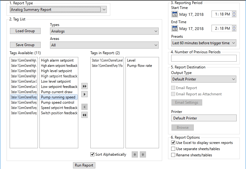 | Analog summary report | Displays the average, minimum, maximum, and total values for a set of selected analog tags within a configured time period. When using this report to summarize flow data, set the Application Property, AnalogSummaryReportTimeUnits to the time unit used to measure the flow. If flow is measured in units per second, the property must be set to 1. If flow is measured in units per minute, the property must be set to 60. |
