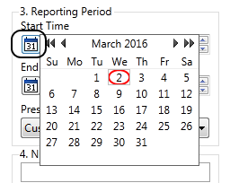 a) Click the calendar button to open a date-selection calendar. (If you wish to report on a time span prior to today.)