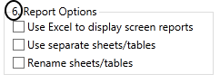 The second and third options apply if previous periods are being generated (step 4) and the output is going to either Excel or Access format. Using separate sheets or tables for each iteration keeps the consecutive periods independent. If the Rename option is selected, you will be prompted for names when the report runs.
