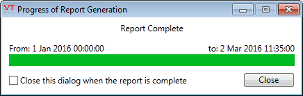 A progress dialog will be shown while the report is being generated. In most cases, you will likely want to select the option, "Close this dialog when the report is complete" so that you do not need to close it after every report runs.