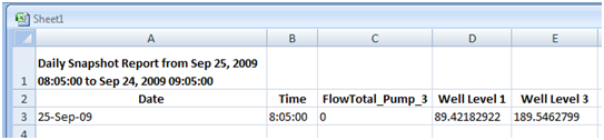 When a daily snapshot report is generated, it contains a report header that identifies the report as a daily snapshot report, and indicates the duration or time period you configured for the report. For example, if at 2:00 pm you select a series of tags, set the time period to Last Week, and run the report, the daily snapshot report will display the value of each tag at 2:00 pm for the last 7 days.