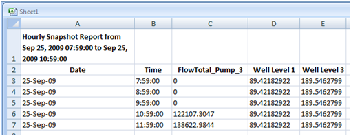 An hourly snapshot report displays a "snapshot" of the value of each included tag, repeated every 60 minutes within the time period you specify.