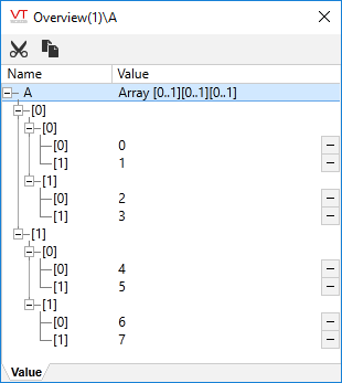 { A is an array of two elements, each of which is an array of two elements, which in turn are arrays of two elements }