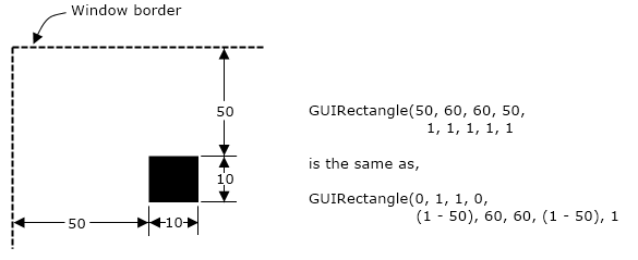 Because the first four parameters of all GUI functions must be constants, the scaling parameters must be used to dynamically change the position and size. This is easier to achieve if the first four parameters are used to define a unit box, and the side-scaling parameters (five through eight) are used to position and size the object being drawn. Because the scaling parameters do not have to be constants, variables may be used to set the object's position.