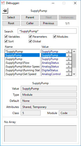 Clicking on any item in the list of modules, variables and parameters will bring up information on the selected item, such as the value of the selected item, the data type (if the selected item is a variable), the attributes of the selected item, the class of the item, and if the selected item is a variable and the "Global" check box is selected, the module to which the variable belongs will be displayed. The name of the selected module, variable or parameter is centered above the Value field.