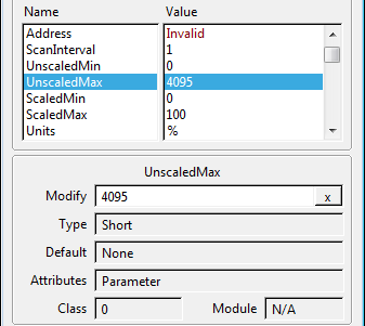 Under the list of modules, variables and parameters is information about the items in the list. (example shows the list for an Analog Input tag with the UnscaledMax parameter selected)