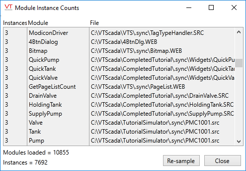 As shown, the Instances utility provides a count of how many instances of each module are running, and the file name where the module can be found. (Most of the files listed are accessible only to Trihedral employees.) For any file that is loaded from the .sync folder, there will usually be a user-accessible version elsewhere in the application folder. Do not edit any file in the .sync folder.