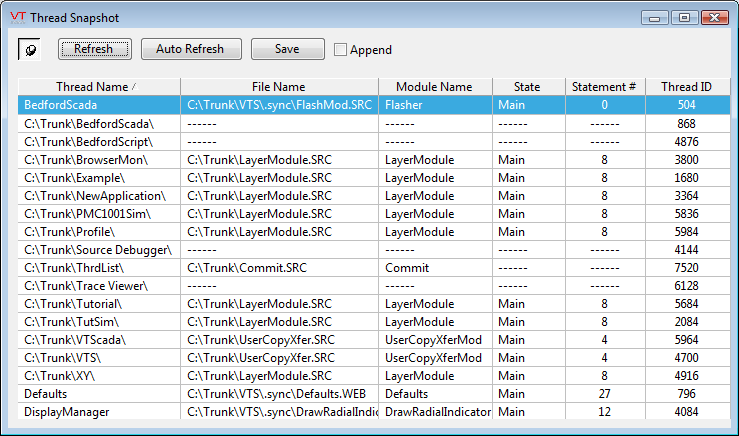 Applications, as well as some system components, run in their own execution threads so that they do not interfere with the execution of other applications or components. The Thread List analysis utility provides a list of the separate threads of execution for which VTScada is responsible.