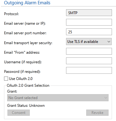 In both cases, configuration of the email server is done using the Alarms tab of the Basic mode of the Edit Properties page in the Application Configuration dialog. Outgoing emails use the SMTP protocol. Incoming use the POP3 protocol. You have a choice of authentication methods and can use OAuth 2.0 if required by your email provider.