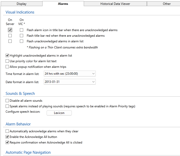 When selected, unacknowledged alarms in the alarm list will flash, to draw operator attention. Separate options exist for the server and VIC If your internet connection is limited by bandwidth restrictions, we recommend that you do not enable this option for the VIC display. |