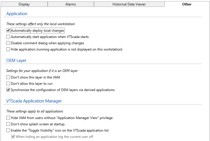 Use the Other tab of the Application Configuration dialog to set fundamental behaviors for your application. Properties here control whether local changes are deployed automatically, whether the application starts automatically when VTScada starts, whether comments are required when applying changes and whether the running application is visible.